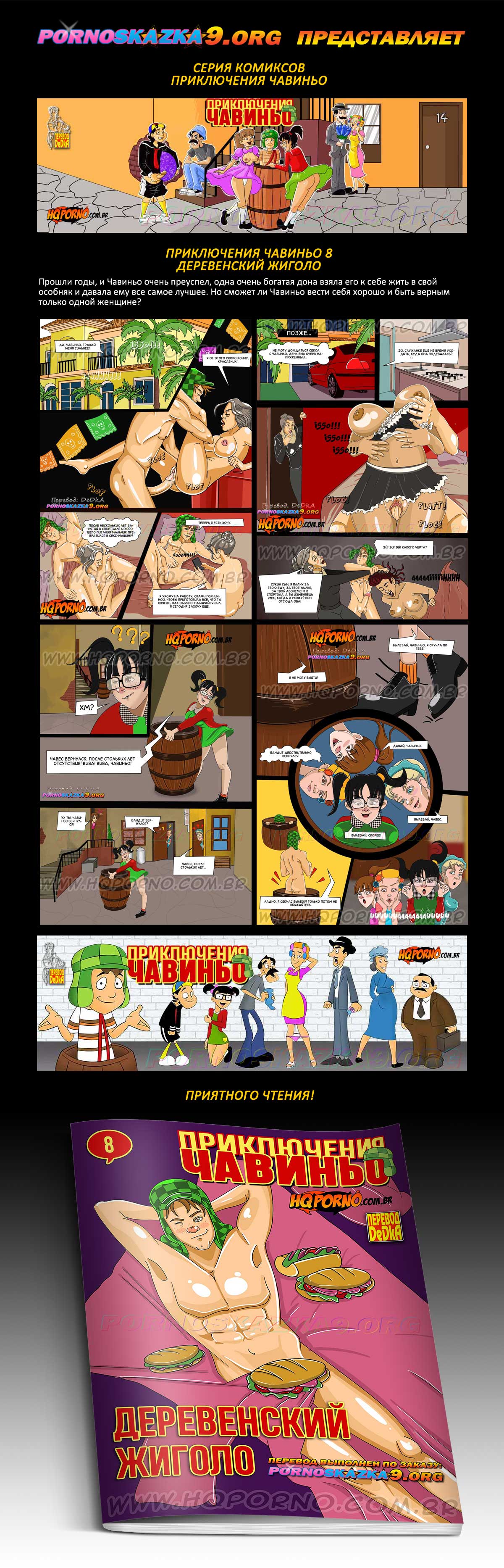 Порно комикс «Приключения Чавиньо. Часть 8. Деревенский жиголо.» Прошли годы, и Чавиньо очень преуспел, одна очень богатая дона взяла его к себе жить в свой особняк и давала ему все самое лучшее. Но сможет ли Чавиньо вести себя хорошо и быть верным только одной женщине?